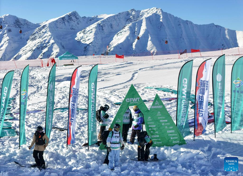 An aerial photo taken on Dec. 4, 2024 shows staff members working on the competition venue for the FWT (Freeride World Tour) qualifier at Jikepulin International Ski Resort in Altay Prefecture, northwest China's Xinjiang Uygur Autonomous Region. In recent years, with the abundant ice and snow resources of the Altay and Tianshan Mountains, Xinjiang are drawing increasing numbers of skiers and snowboarders, driven by China's expanding winter sports industry and ice-and-snow economy. A number of high-grade ski resorts have been constructed, attracting a large number of domestic and international tourists and gradually transforming ice and snow resources into economic benefits. (Xinhua/Hu Huhu)