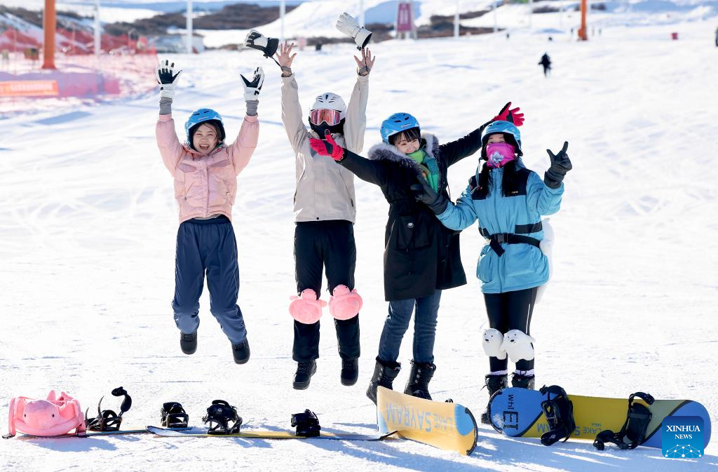 Tourists pose for photos in Urumqi, northwest China's Xinjiang Uygur Autonomous Region, Jan. 27, 2025. In recent years, with the abundant ice and snow resources of the Altay and Tianshan Mountains, Xinjiang are drawing increasing numbers of skiers and snowboarders, driven by China's expanding winter sports industry and ice-and-snow economy. A number of high-grade ski resorts have been constructed, attracting a large number of domestic and international tourists and gradually transforming ice and snow resources into economic benefits. (Xinhua/Wang Fei)