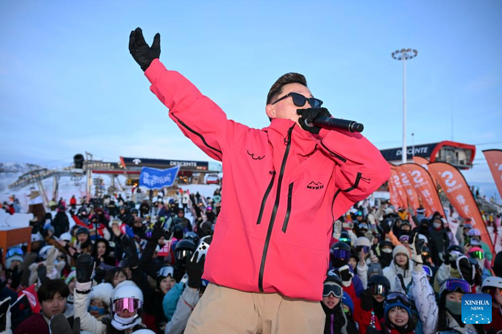 Live host Li Quan (front) interacts with the audience at Jiangjunshan International Ski Resort in Altay, northwest China's Xinjiang Uygur Autonomous Region, Jan. 28, 2025. In recent years, with the abundant ice and snow resources of the Altay and Tianshan Mountains, Xinjiang are drawing increasing numbers of skiers and snowboarders, driven by China's expanding winter sports industry and ice-and-snow economy. A number of high-grade ski resorts have been constructed, attracting a large number of domestic and international tourists and gradually transforming ice and snow resources into economic benefits. (Xinhua/Hu Huhu)