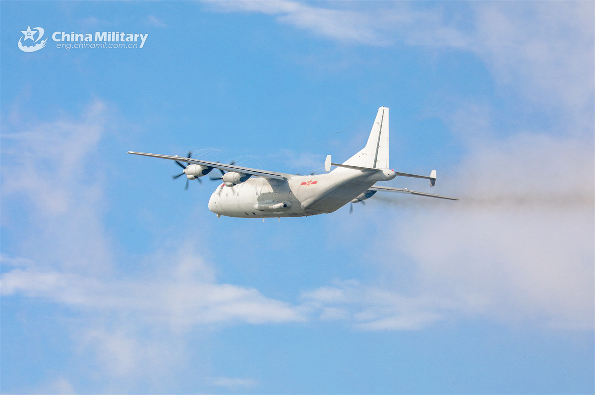 Y-9 medium-lift transport aircraft attached to a regiment with the Chinese PLA Navy soars into the sky during a multi-subject flight training exercise on March 24, 2025. (eng.chinamil.com.cn/Photo by Qin Qianjiang)