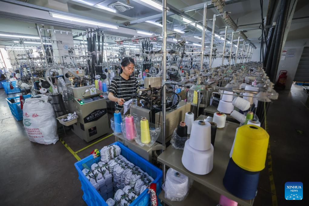 A worker is seen busy at the workshop of Baoge, a hosiery manufacturing enterprise, in Zhuji City, east China's Zhejiang Province on April 10, 2025. (Xinhua/Xu Yu)