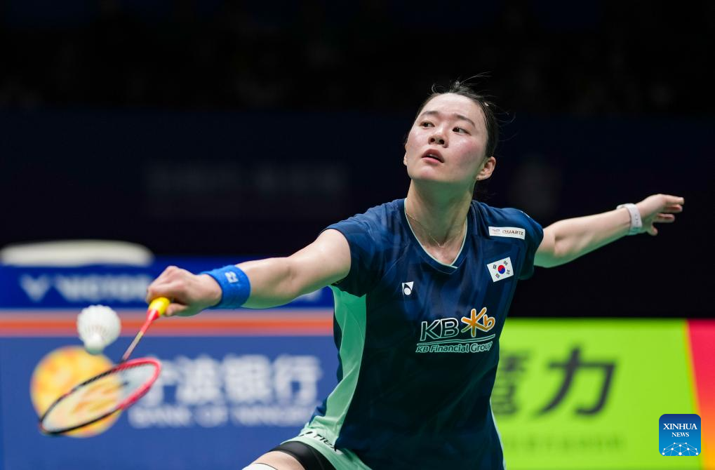 Kim Ga Eun of South Korea hits a return during the women's singles quarterfinal match against Gao Fangjie of China at Badminton Asia Championships 2025 in Ningbo, east China's Zhejiang Province, April 11, 2025. (Xinhua/Sun Fei)