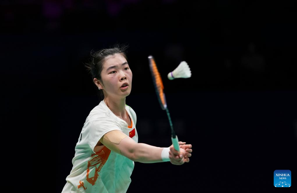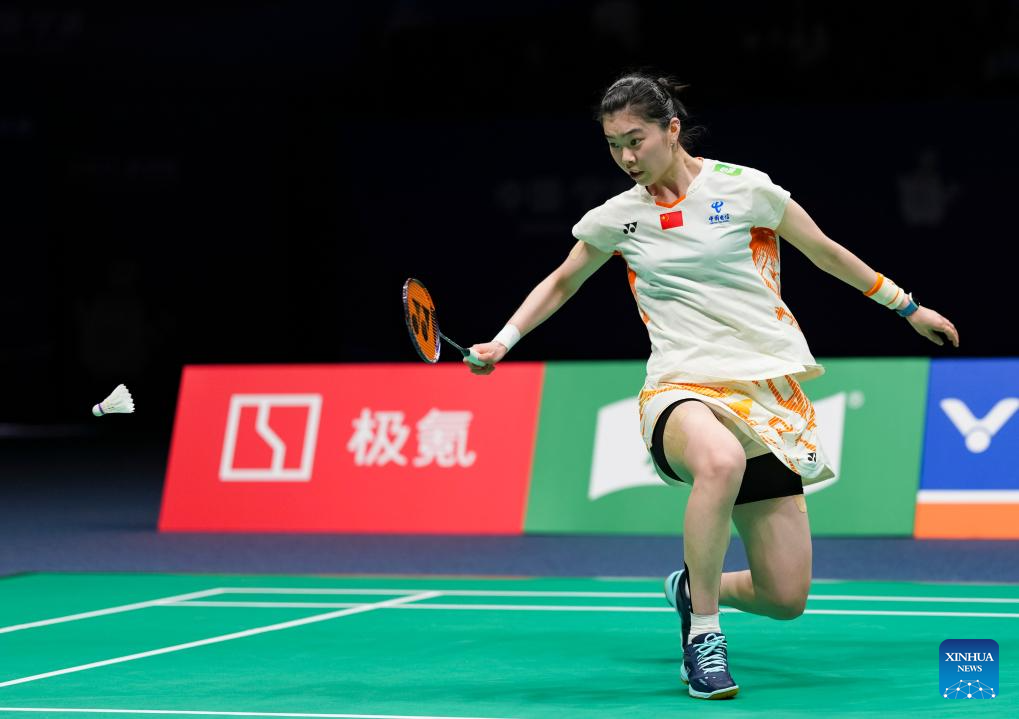 Gao Fangjie of China hits the shuttlecock during the women's singles quarterfinal match against Kim Ga Eun of South Korea at Badminton Asia Championships 2025 in Ningbo, east China's Zhejiang Province, April 11, 2025. (Xinhua/Sun Fei)