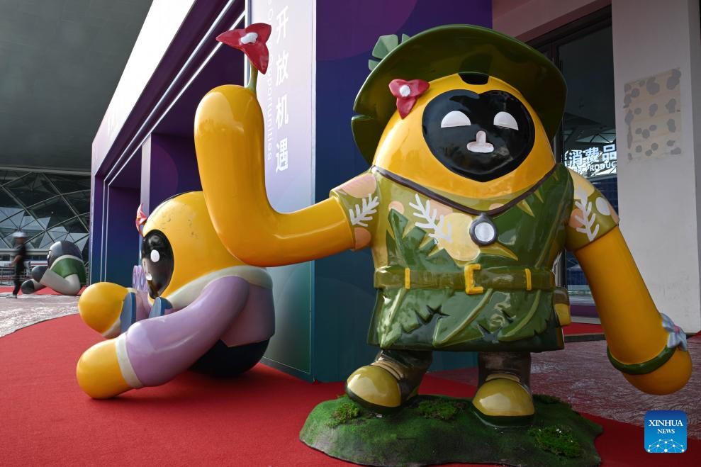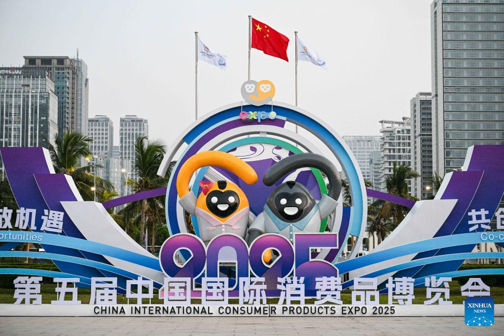 This photo taken on April 10, 2025 shows the mascot of the upcoming fifth China International Consumer Products Expo (CICPE) at the Hainan International Convention and Exhibition Center in Haikou, capital of south China's Hainan Province. (Xinhua/Pu Xiaoxu)