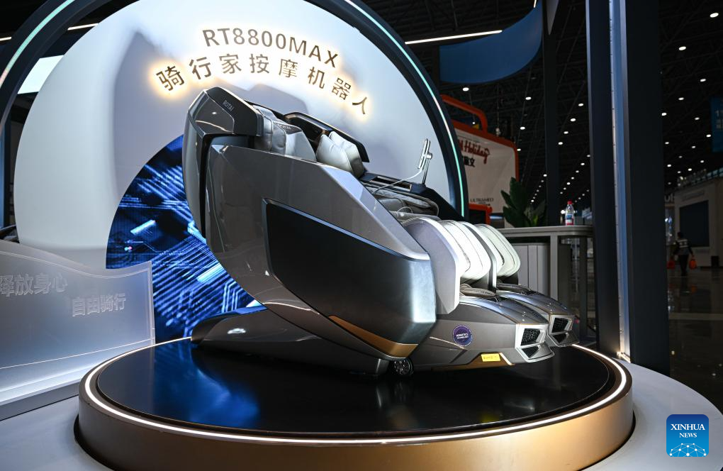 This photo taken on April 10, 2025 shows a massage robot at the Hainan International Convention and Exhibition Center, the main venue of the upcoming fifth China International Consumer Products Expo (CICPE) in Haikou, capital of south China's Hainan Province. (Xinhua/Pu Xiaoxu)