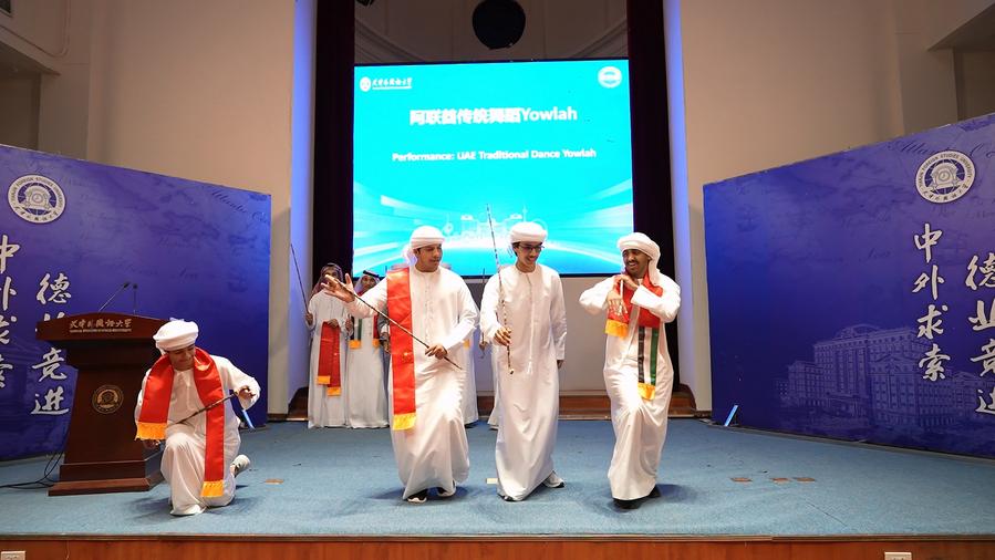 UAE students perform a traditional dance at Tianjin Foreign Studies University (TFSU), in north China's Tianjin, on April 7, 2025. (Xinhua/ Hu Zhenze)