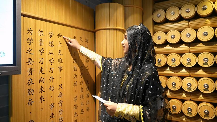 UAE student Bashayer Omar learns Chinese proverbs at the Center for Language Education and Cooperation under China's Ministry of Education in Beijing, capital of China, on April 7, 2025. (Xinhua/ Hu Zhenze)