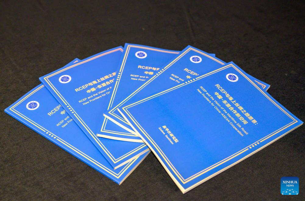 This photo taken on April 8, 2025 shows a report titled "RCEP and the Vision of the Maritime Silk Road: New Frontiers for China-ASEAN Cooperation." The report was released Friday by Xinhua Institute, the think tank of Xinhua News Agency, at the China-ASEAN Media and Think Tank Forum in Kuala Lumpur. (Xinhua/Yin Gang)