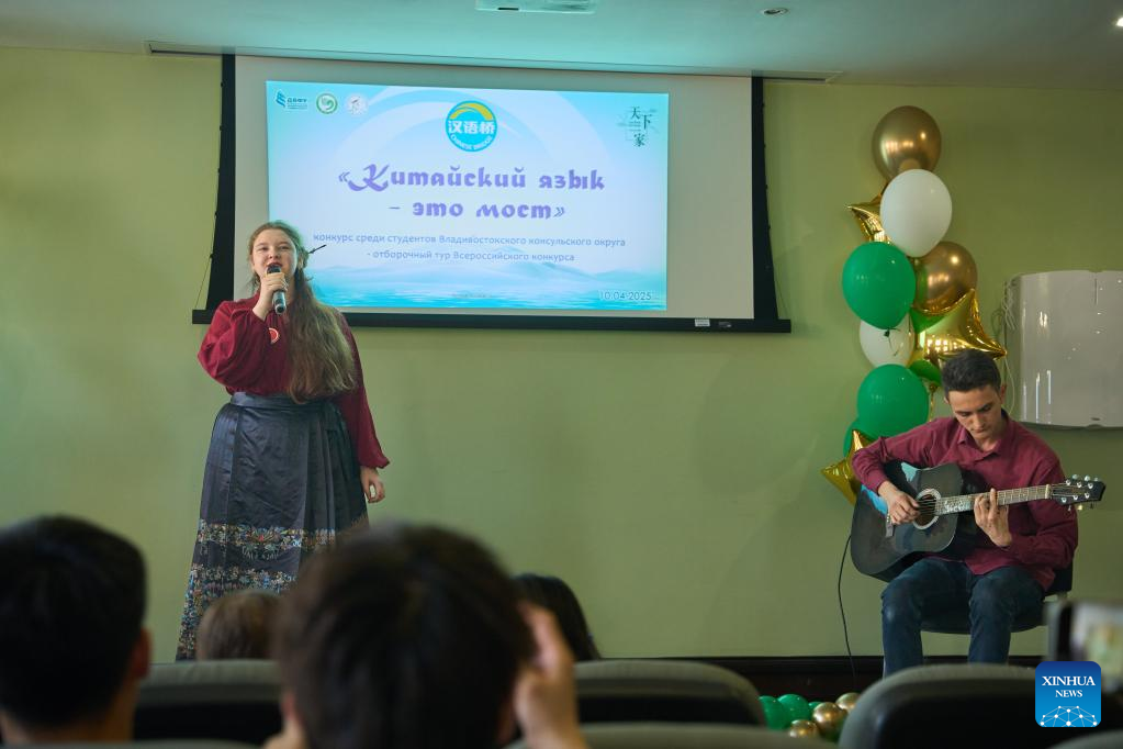 A contestant (L) performs recitation of "The Ballad of Mulan", a classical Chinese poem eulogizing Hua Mulan, the legendary woman warrior in Chinese ancient history, during the preliminary round of the 24th "Chinese Bridge" Chinese Proficiency Competition for Foreign College Students held in Vladivostok, Russia, on April 10, 2025. Covering various dimensions including Chinese history, geography, literature and arts, the competition featured three main sections: themed speeches, a quiz and impromptu speeches, and talent performances.