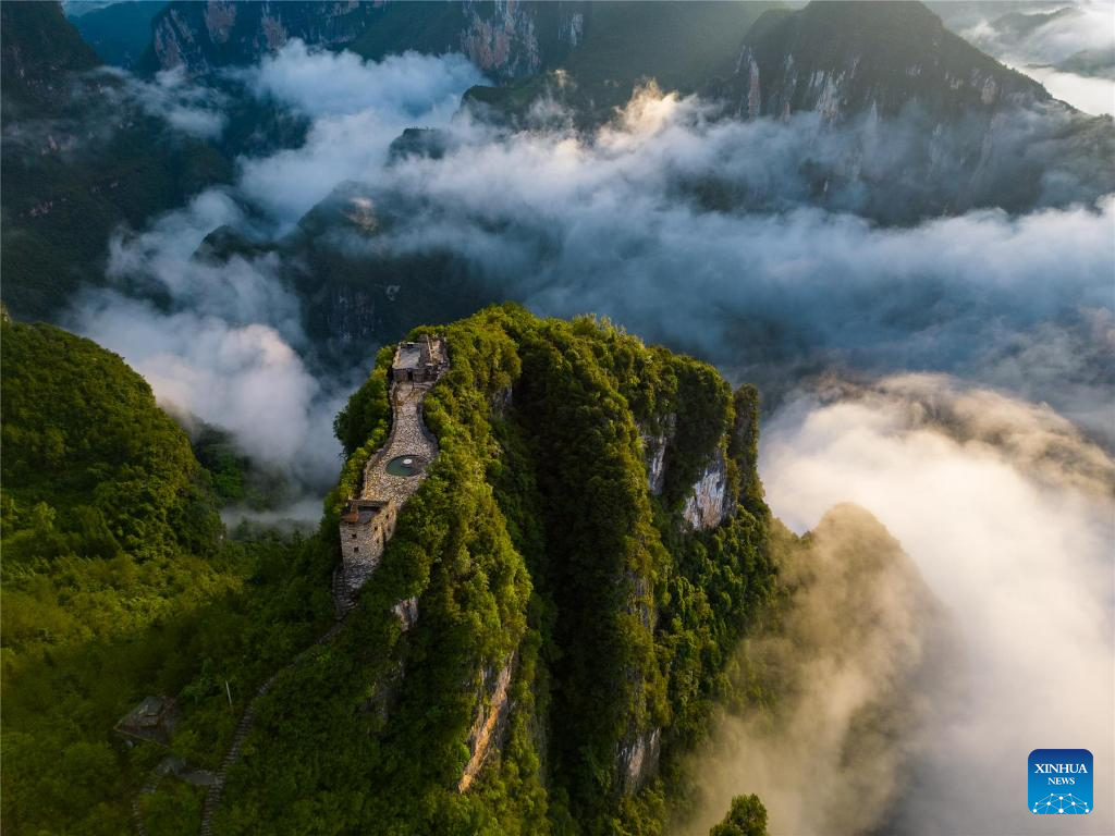An aerial drone photo taken on April 10, 2025 shows the scenery in the Yunyang Geopark in southwest China's Chongqing Municipality. (Xinhua)
