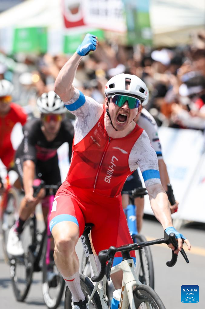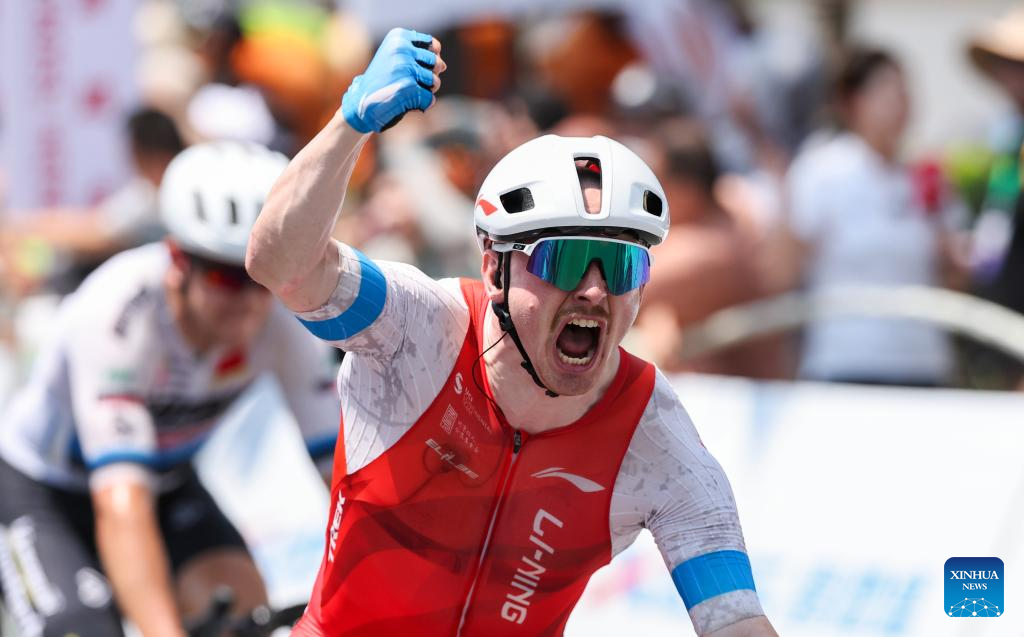 Alexander Salby of Li Ning Star celebrates winning Stage 5 at the 16th Tour of Hainan cycling race from Dongfang to Sanya, south China's Hainan Province, April 11, 2025. (Xinhua/Yang Guanyu)