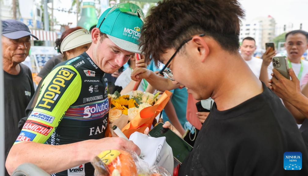 Kyrylo Tsarenko (Front L) of Solution Tech Vini Fantini signs autographs for supporters after Stage 5 at the 16th Tour of Hainan cycling race from Dongfang to Sanya, south China's Hainan Province, April 11, 2025. (Xinhua/Yang Guanyu)
