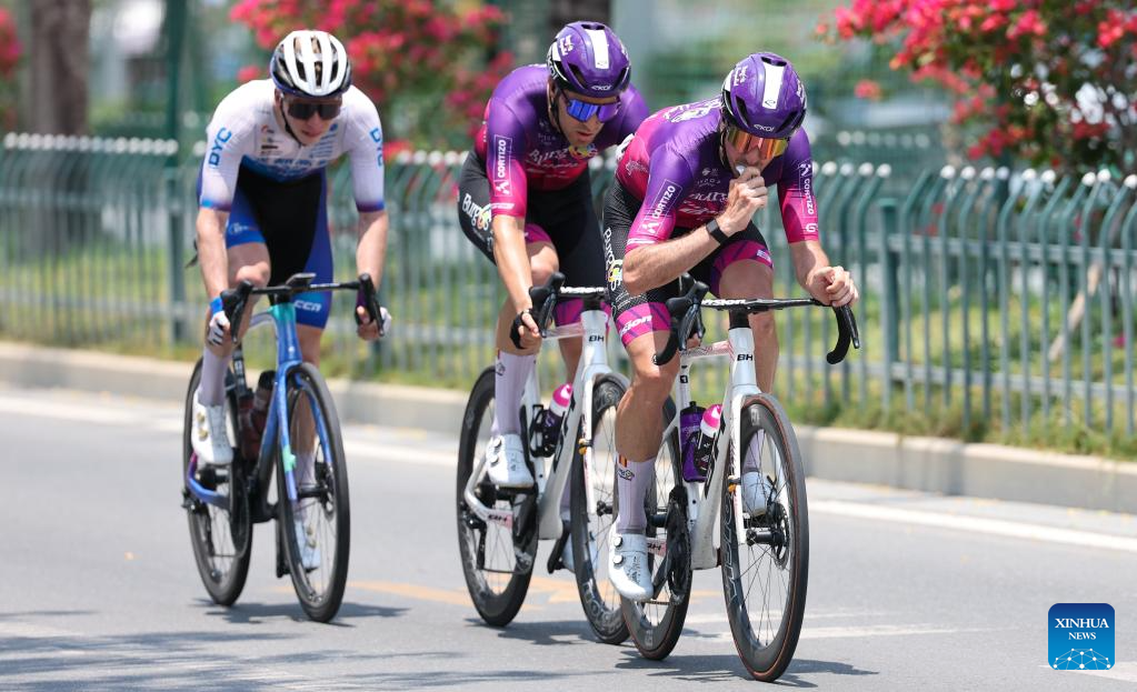 Alexander Salby (C) of Li Ning Star celebrates winning Stage 5 at the 16th Tour of Hainan cycling race from Dongfang to Sanya, south China's Hainan Province, April 11, 2025. (Xinhua/Yang Guanyu)