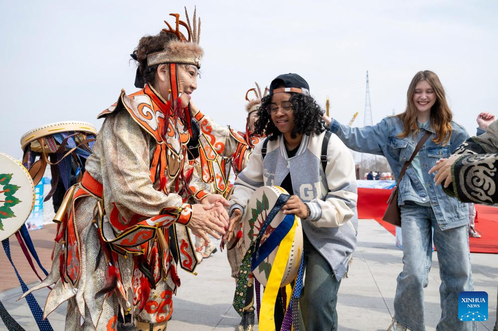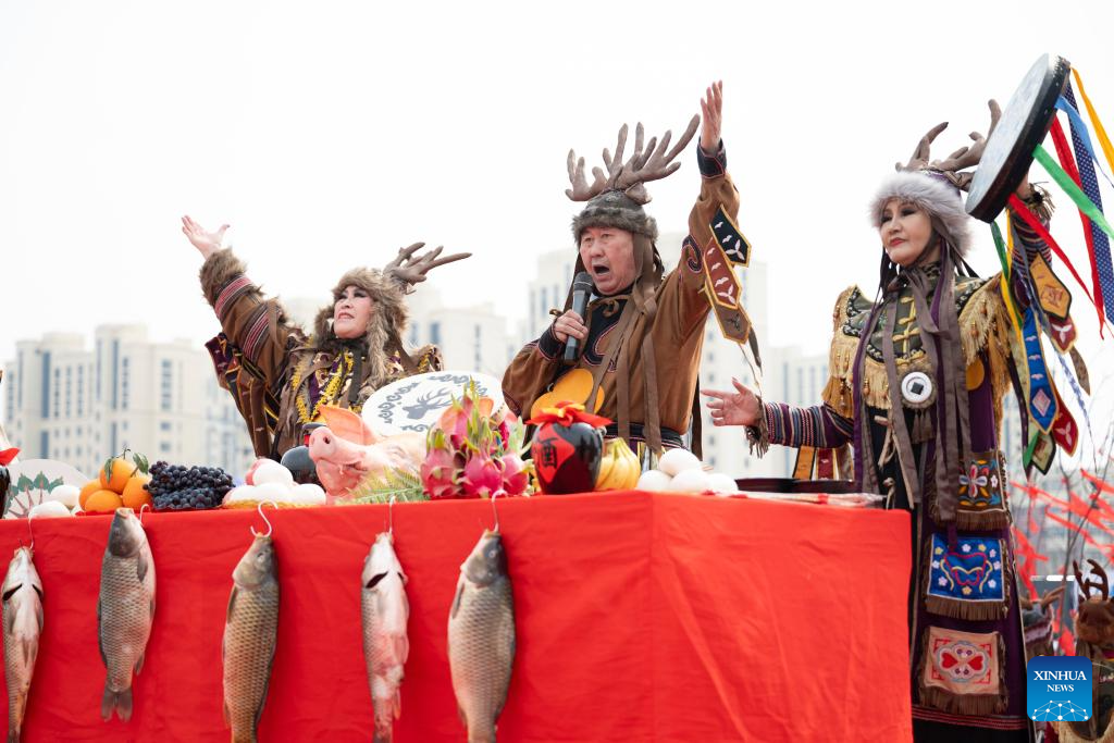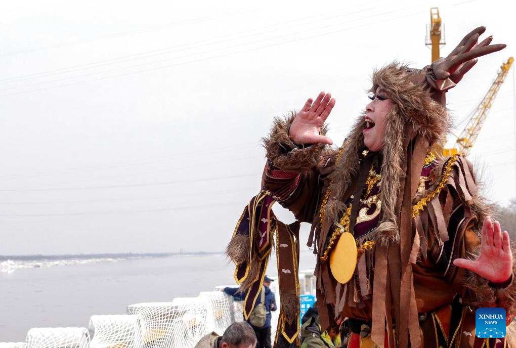 Actors perform a blessing ceremony of Hezhe ethnic group at the main venue of Hanjiang festival in Jiamusi, northeast China's Heilongjiang Province, April 12, 2025. (Xinhua/Zhang Tao)