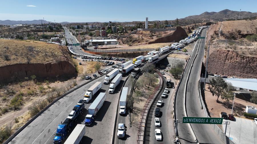 An aerial drone photo shows a trailer truck (lower left) transporting vehicles on a highway in Nogales, Sonora, Mexico, April 2, 2025. (Xinhua/Li Mengxin)