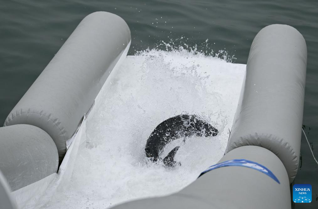 A Chinese sturgeon slides into the Yangtze River through a release channel in Yichang City, central China's Hubei Province, April 12, 2025. More than 20,000 second-generation Chinese sturgeons were released into the Yangtze River during a release activity here on Saturday. (Xinhua/Du Zixuan)