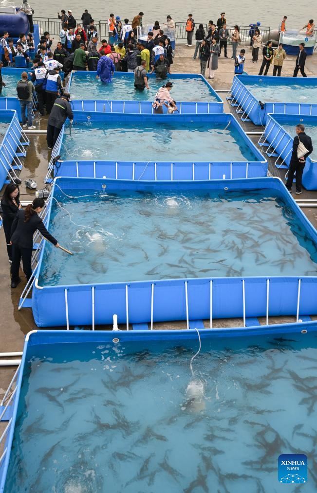 This photo taken on April 12, 2025 shows an activity to release Chinese sturgeons into the Yangtze River in Yichang City, central China's Hubei Province. More than 20,000 second-generation Chinese sturgeons were released into the Yangtze River during a release activity here on Saturday. (Xinhua/Du Zixuan)