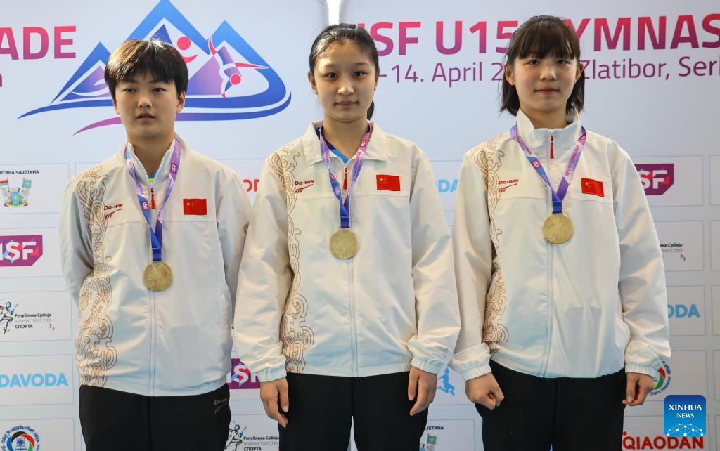 Gold medalists Yang Congxi, Jiang Sihan and Zhou Yuhan (L to R) of China pose during the awarding ceremony for table tennis Girls' team event at the ISF (International School Sport Federation) U15 Gymnasiade in Zlatibor, Serbia, April 12, 2025. (Photo by Predrag Milosavljevic/Xinhua)