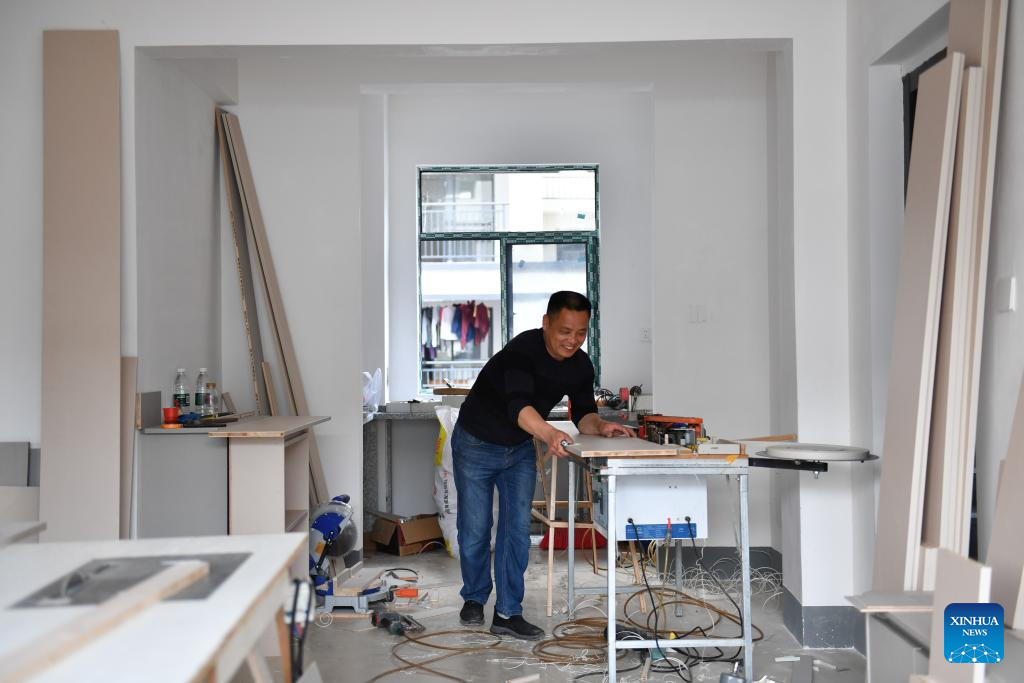 A carpenter works for a new host at a resettlement site in Zhoumensi Township, Zixing City, central China's Hunan Province, April 10, 2025. (Xinhua/Chen Zhenhai)