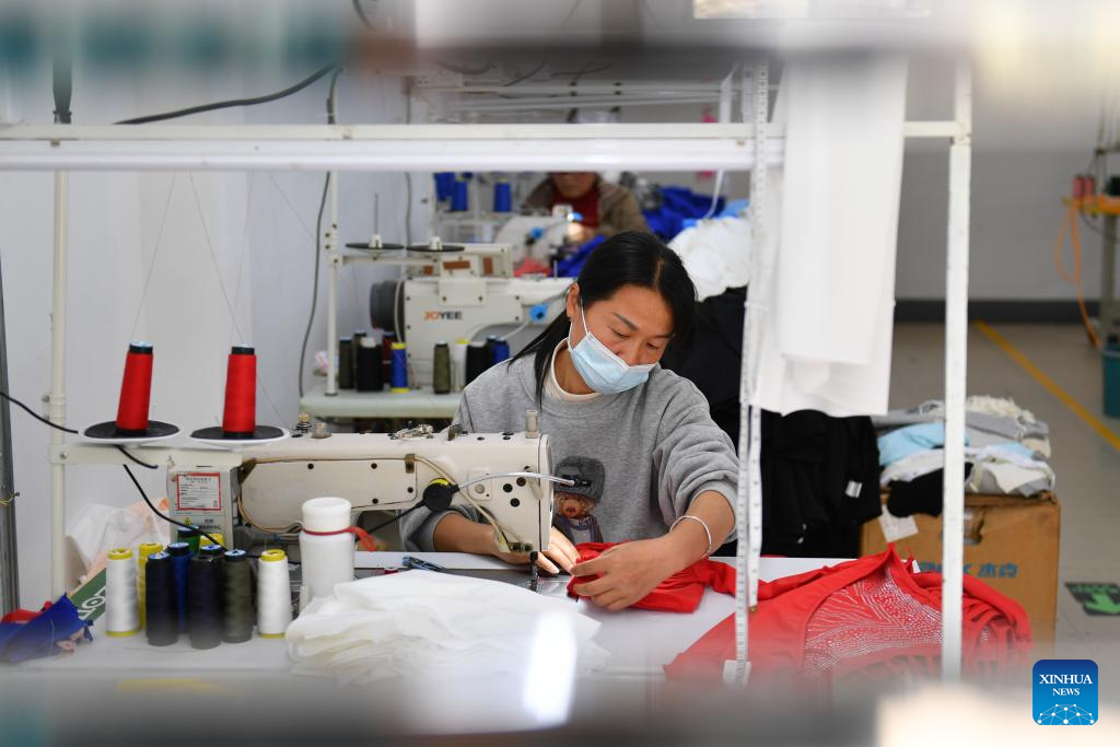 A woman works at a clothing factory in a resettlement site in Zhoumensi Township, Zixing City, central China's Hunan Province, April 10, 2025. (Xinhua/Chen Zhenhai)
