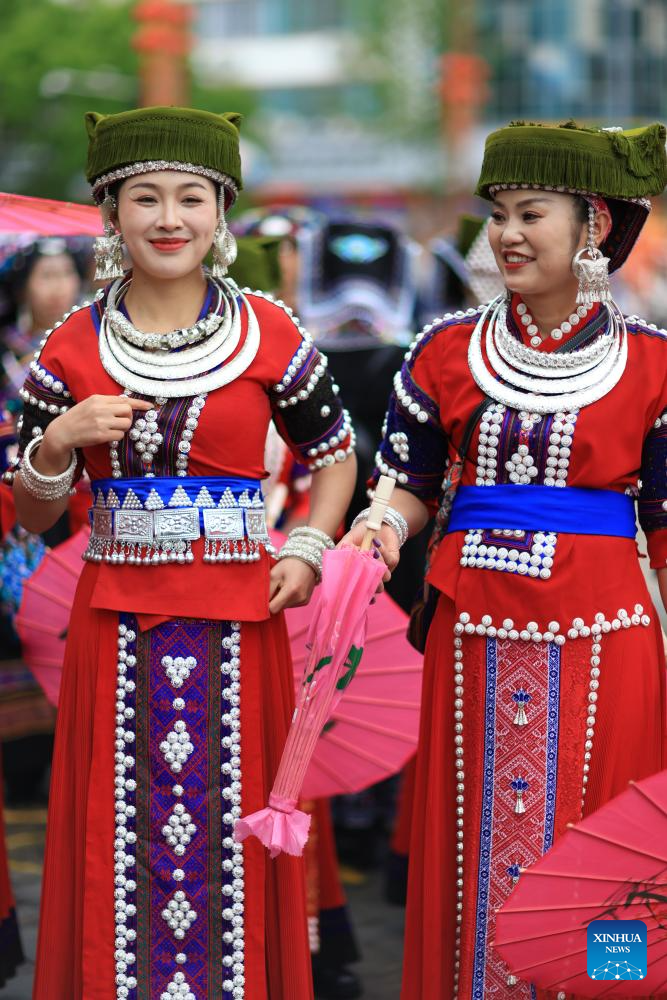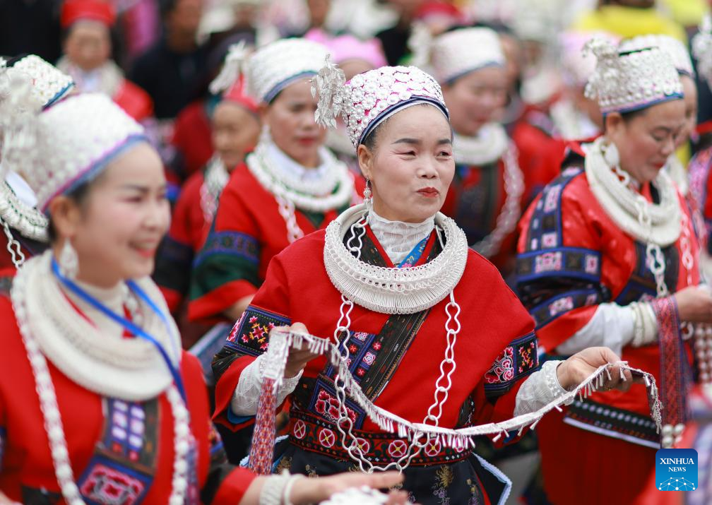 People in ethnic costumes attend an activity to celebrate the Miao Sisters Festival in Taijiang County, southwest China's Guizhou Province, April 12, 2025. Recognized as a national intangible cultural heritage, the Miao Sisters Festival was celebrated here on Saturday. (Xinhua/Yang Wenbin)