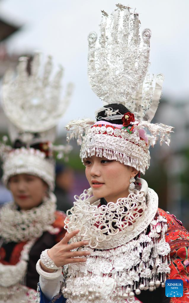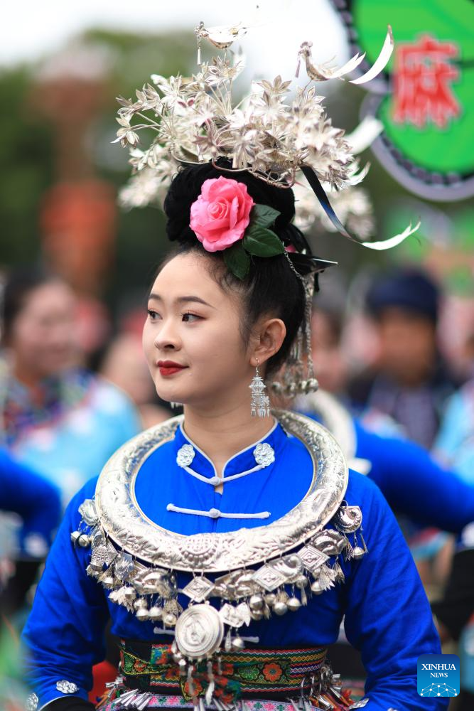A woman in ethnic costume attends an activity to celebrate the Miao Sisters Festival in Taijiang County, southwest China's Guizhou Province, April 12, 2025. Recognized as a national intangible cultural heritage, the Miao Sisters Festival was celebrated here on Saturday. (Xinhua/Liu Xu)