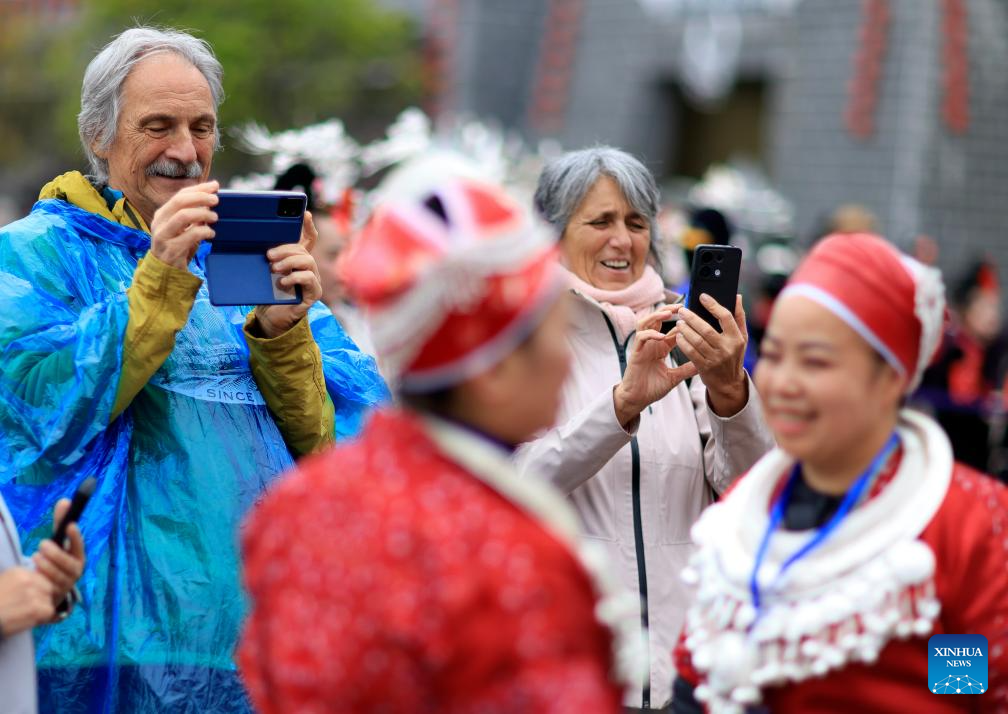 Foreign tourists take photos at an activity to celebrate the Miao Sisters Festival in Taijiang County, southwest China's Guizhou Province, April 12, 2025. Recognized as a national intangible cultural heritage, the Miao Sisters Festival was celebrated here on Saturday. (Xinhua/Liu Xu)