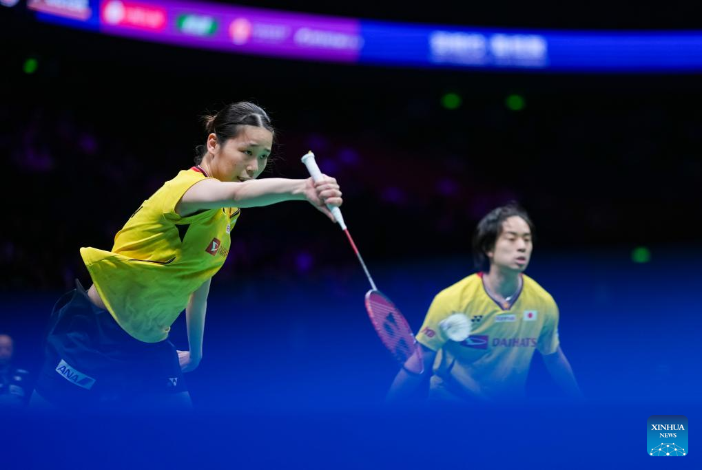 Midorikawa Hiroki/Saito Natsu (L) of Japan compete during the mixed doubles final match against Tang Chun Man/Tse Ying Suet of China's Hong Kong at Badminton Asia Championships 2025 in Ningbo, east China's Zhejiang Province, April 13, 2025. (Xinhua/Sun Fei)