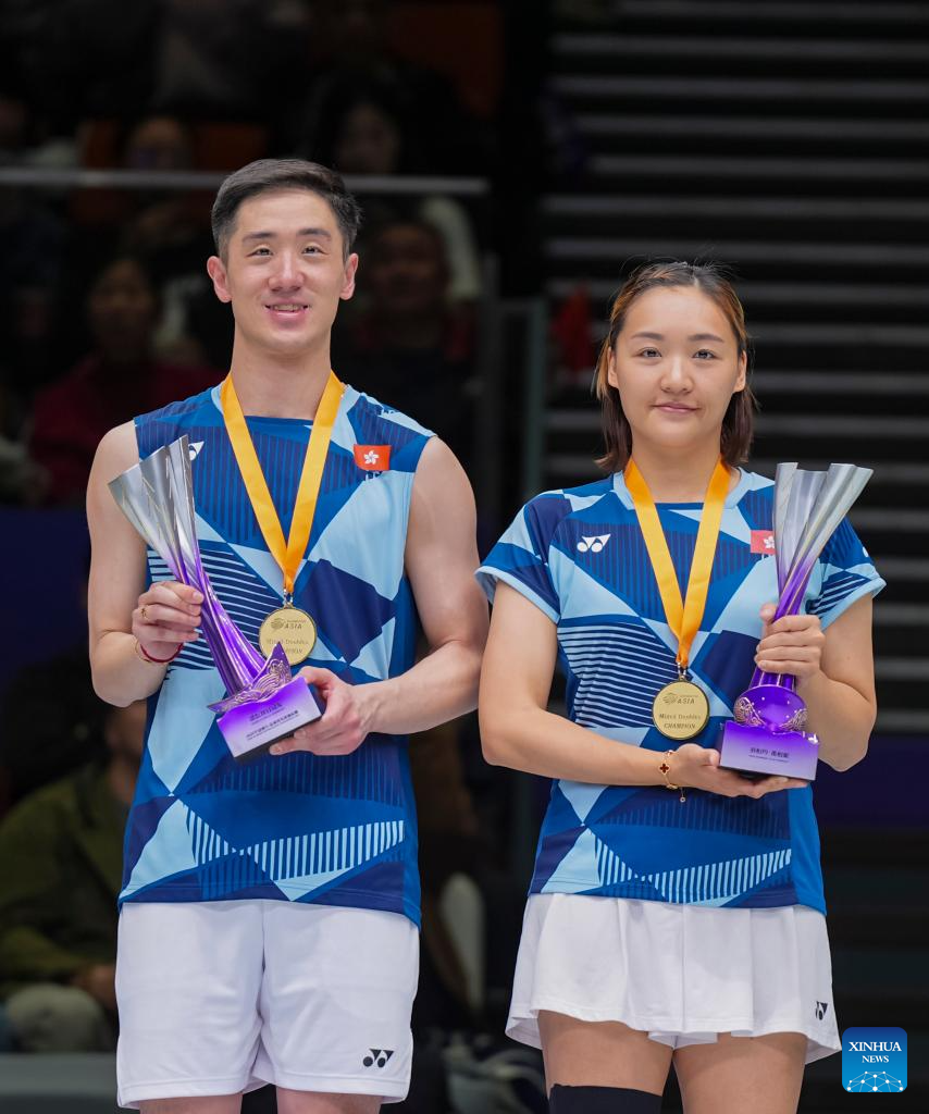 Gold medalists Tang Chun Man (L)/Tse Ying Suet of China's Hong Kong pose during the awarding ceremony for the mixed doubles event at Badminton Asia Championships 2025 in Ningbo, east China's Zhejiang Province, April 13, 2025. (Xinhua/Sun Fei)