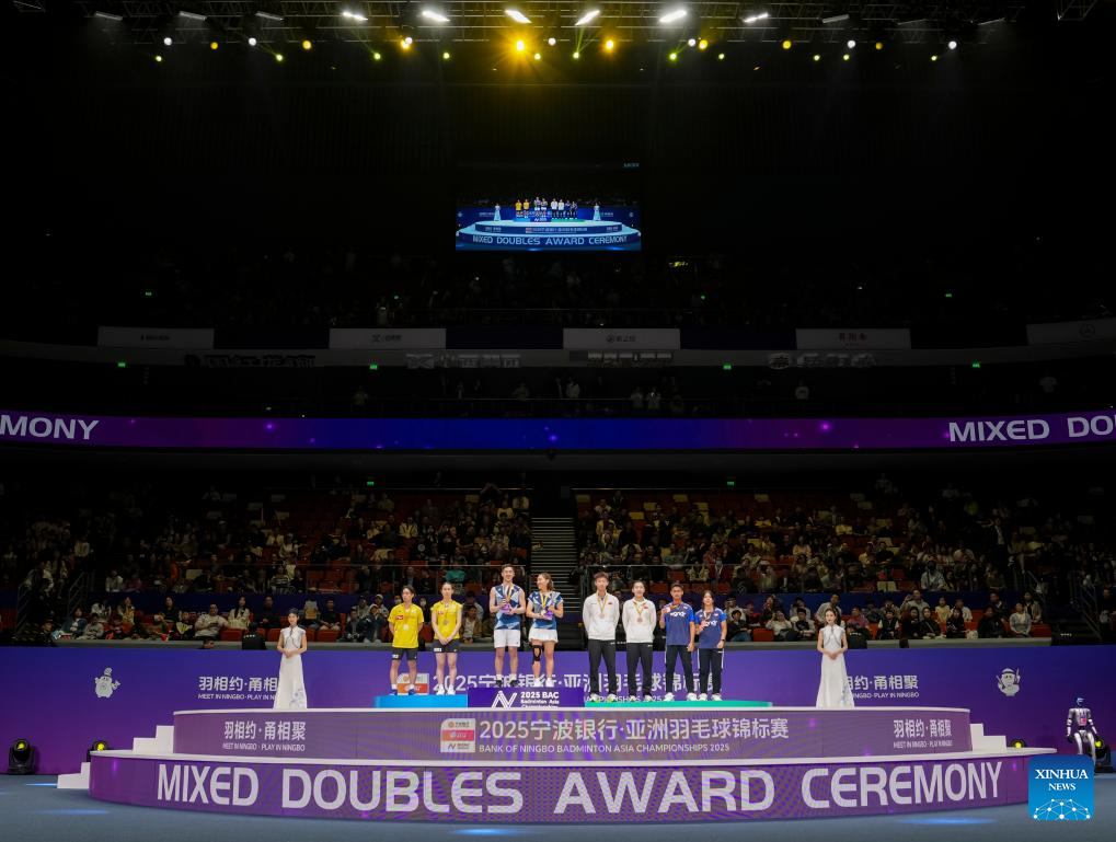 Gold medalists Tang Chun Man (3rd L)/Tse Ying Suet (4th L) of China's Hong Kong, silver medalists Midorikawa Hiroki (1st L)/Saito Natsu (2nd L) of Japan, bronze medalists Jiang Zhenbang (4th R)/Wei Yaxin (3rd R) of China and Jafar Hidayatullah (2nd R)/Felisha Alberta Nathaniel Pasaribu of Indonesia attend the awarding ceremony for the mixed doubles event at Badminton Asia Championships 2025 in Ningbo, east China's Zhejiang Province, April 13, 2025. (Xinhua/Sun Fei)