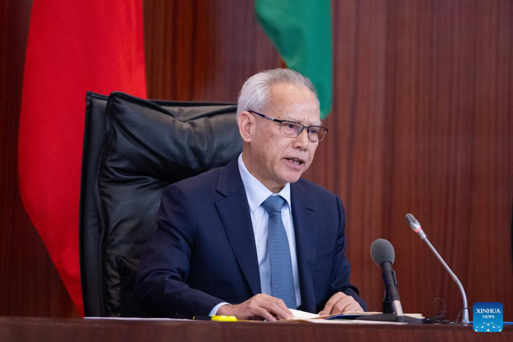 Sam Hou Fai, chief executive of China's Macao Special Administrative Region (SAR), delivers the 2025 fiscal year policy address in Macao, south China, April 14, 2025. (Xinhua/Cheong Kam Ka)