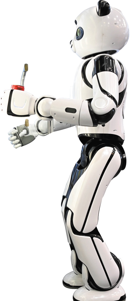 A humanoid robot opens a can in the exhibition hall of UBTech Robotics in Shenzhen, Guangdong province. (Deng Hua/Xinhua)