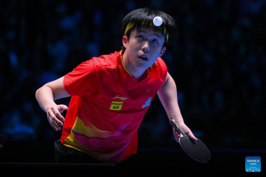 Wang Chuqin of China hits a return during the men's singles group match between Wang Chuqin of China and Aditya Sareen of Australia at the ITTF Men's and Women's World Cup 2025 in Macao, China, April 15, 2025. (Xinhua/Chen Duo)