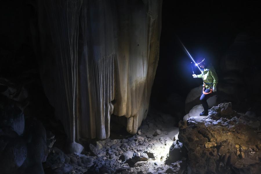 A tourist visits a natural depression in Pingtang County, southwest China's Guizhou Province, on Feb. 19, 2025. (Xinhua/Ou Dongqu)