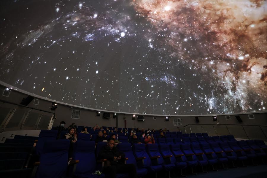 People watch a digital dome screen film at an experience planetarium of an astronomy-themed town in Pingtang County, southwest China's Guizhou Province, Feb. 18, 2025. (Xinhua/Ou Dongqu)