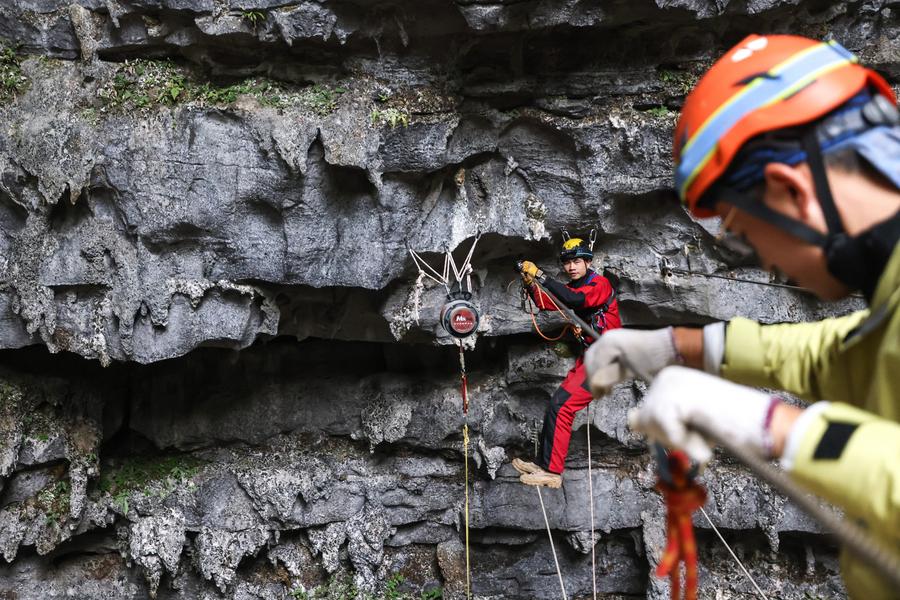 Tourists visit a natural depression in Pingtang County, southwest China's Guizhou Province, on Feb. 19, 2025. (Xinhua/Ou Dongqu)