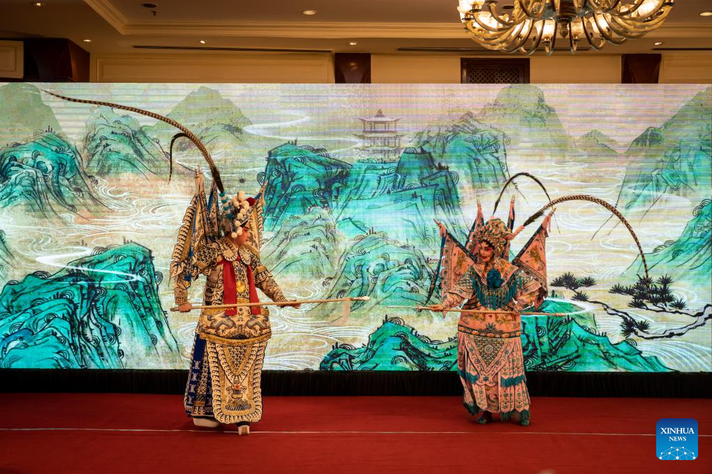 A Cantonese opera excerpt is performed at the "Charming Guangzhou Meets Nepal" city image showcase in Kathmandu, Nepal, April 15, 2025. The Chinese city of Guangzhou on Tuesday showcased its city image in the Nepali capital in efforts to deepen cultural exchanges and cooperation. (Photo by Hari Maharjan/Xinhua)