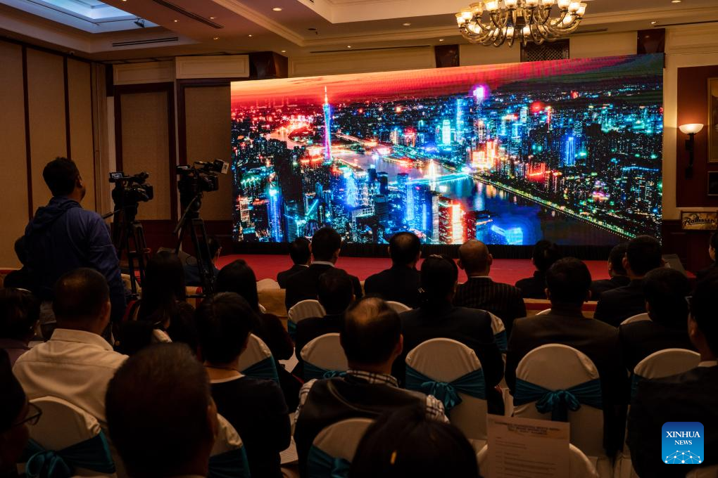 Guests watch a city image film at the "Charming Guangzhou Meets Nepal" city image showcase in Kathmandu, Nepal, April 15, 2025. The Chinese city of Guangzhou on Tuesday showcased its city image in the Nepali capital in efforts to deepen cultural exchanges and cooperation. (Photo by Hari Maharjan/Xinhua)