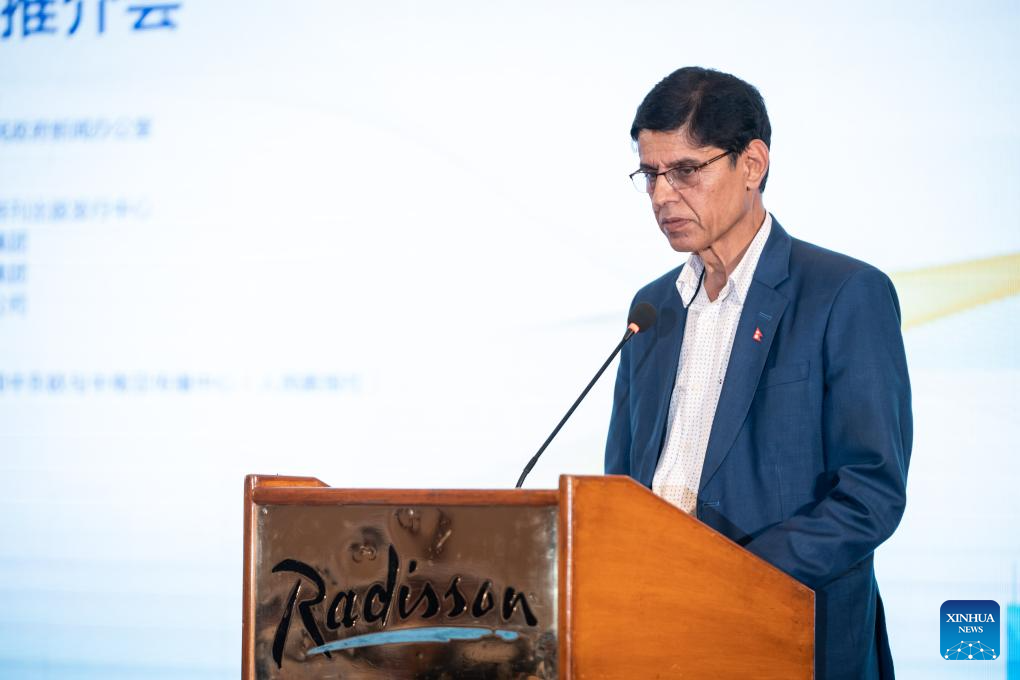 Binod Prakash Singh, secretary of Nepal's Ministry of Culture, Tourism and Civil Aviation, speaks at the "Charming Guangzhou Meets Nepal" city image showcase in Kathmandu, Nepal, April 15, 2025. The Chinese city of Guangzhou on Tuesday showcased its city image in the Nepali capital in efforts to deepen cultural exchanges and cooperation. (Photo by Hari Maharjan/Xinhua)