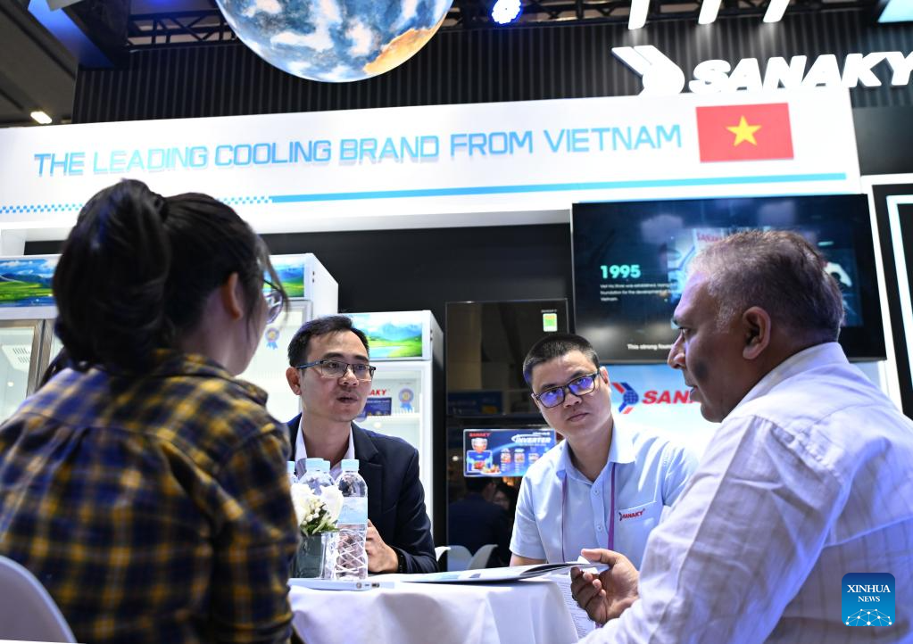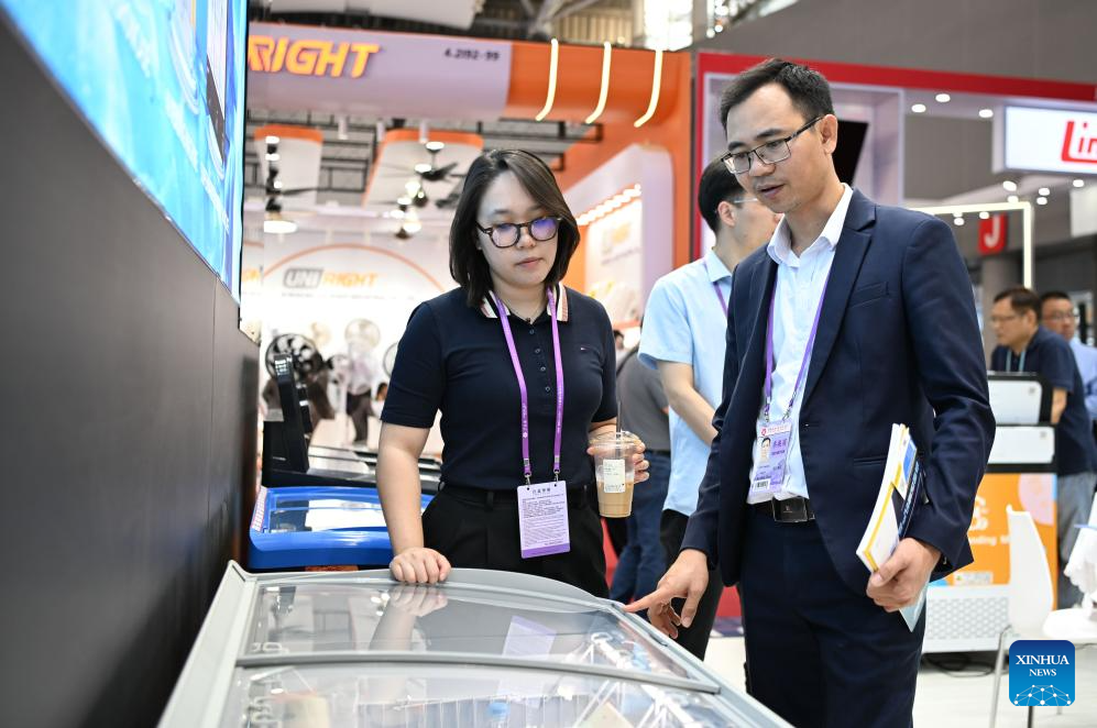Huynh Ngoc Hoa (C) introduces a refrigerator produced by his enterprise to a customer at the 137th edition of the China Import and Export Fair, also known as the Canton Fair, in Guangzhou, south China's Guangdong Province, April 15, 2025. (Xinhua/Lu Hanxin)