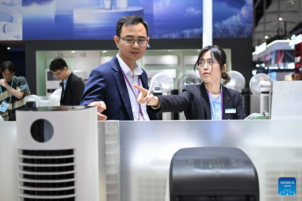Huynh Ngoc Hoa (L) views air conditioning fan products exhibited by a Chinese enterprise at the 137th edition of the China Import and Export Fair, also known as the Canton Fair, in Guangzhou, south China's Guangdong Province, April 15, 2025. (Xinhua/Deng Hua)