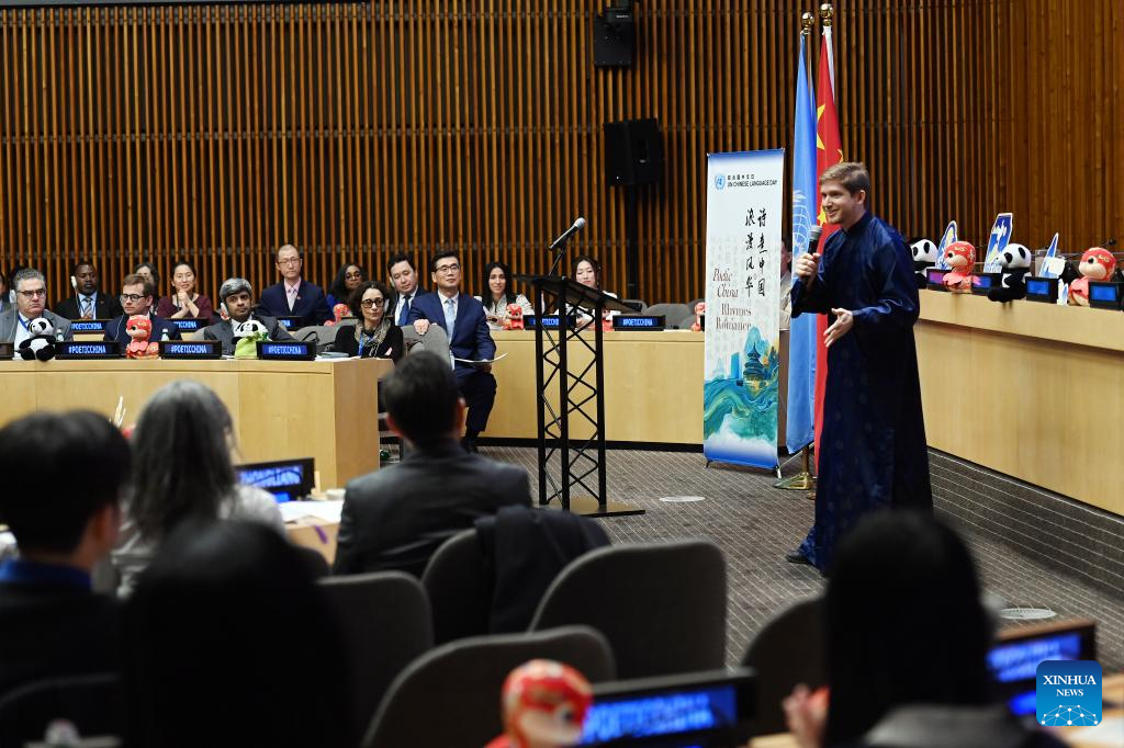 Zach Danz, a UN staff member, reads an excerpt from the Book of Changes during an event marking the 16th UN Chinese Language Day at the UN headquarters in New York, on April 15, 2025. (Xinhua/Li Rui)
