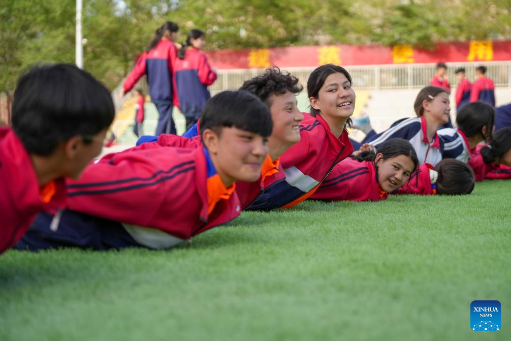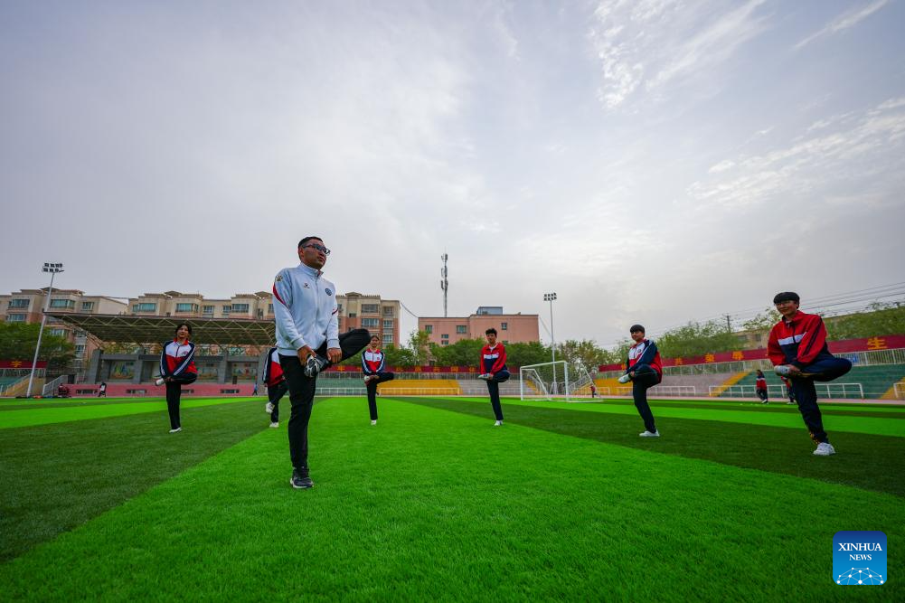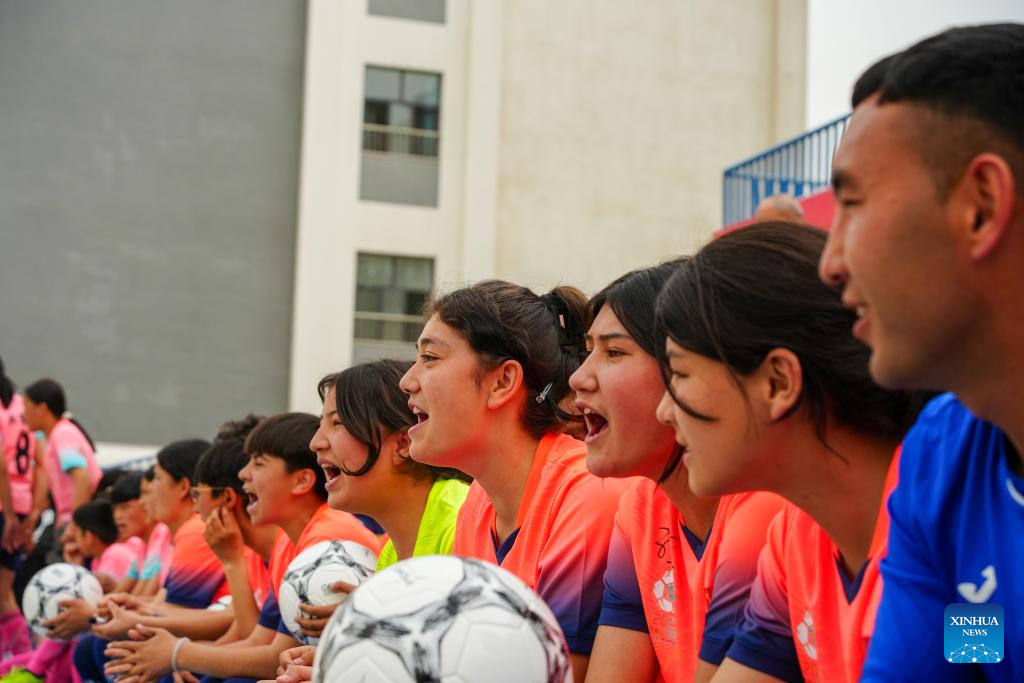 Girls of the U13 football team of Artux City take part in a training session in Artux City, Kizilsu Kirgiz Autonomous Prefecture in northwest China's Xinjiang Uygur Autonomous Region, April 10, 2025. (Xinhua/Xu Hongyan)