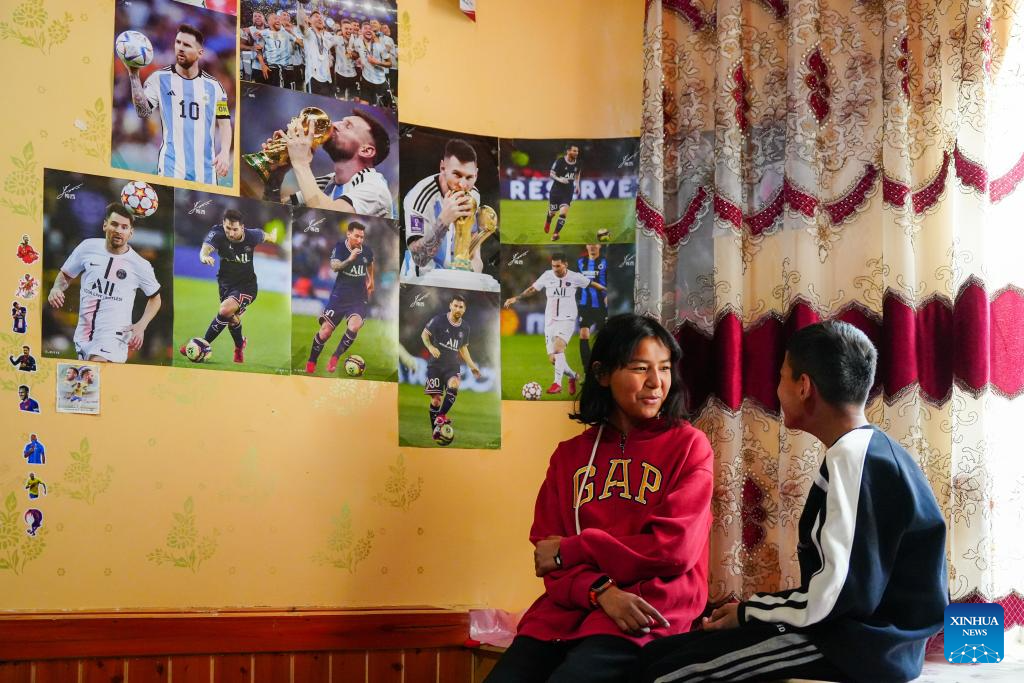 Aniza Abudurusul (L) , a member of the U13 girls' football team of Artux City, chats with her younger brother at home in Artux City, Kizilsu Kirgiz Autonomous Prefecture in northwest China's Xinjiang Uygur Autonomous Region, April 13, 2025. (Xinhua/Xu Hongyan)