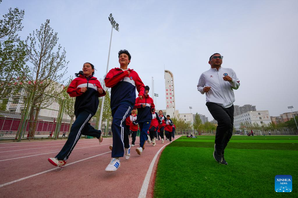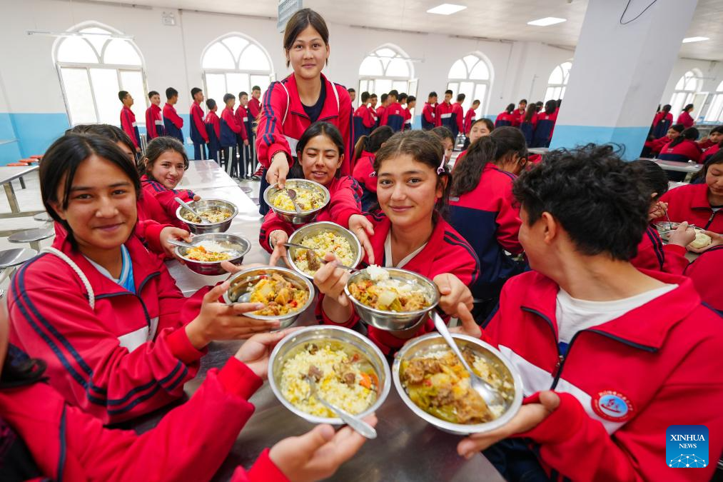 Girls of the U13 football team of Artux City show their lunch at school in Artux City, Kizilsu Kirgiz Autonomous Prefecture in northwest China's Xinjiang Uygur Autonomous Region, April 14, 2025. (Xinhua/Xu Hongyan)