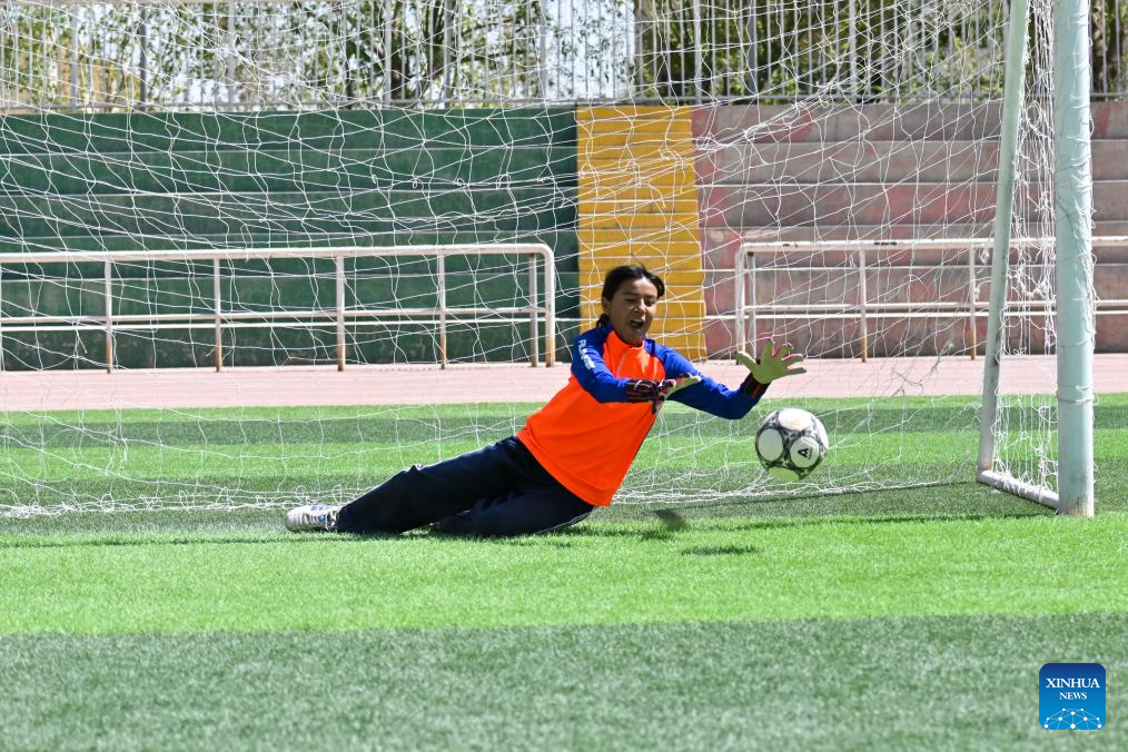 Aniza Abudurusul, a member of the U13 girls' football team of Artux City, takes part in a training session in Artux City, Kizilsu Kirgiz Autonomous Prefecture in northwest China's Xinjiang Uygur Autonomous Region, April 10, 2025. (Xinhua/Xu Hongyan)