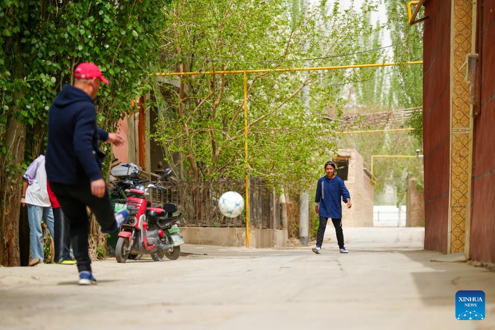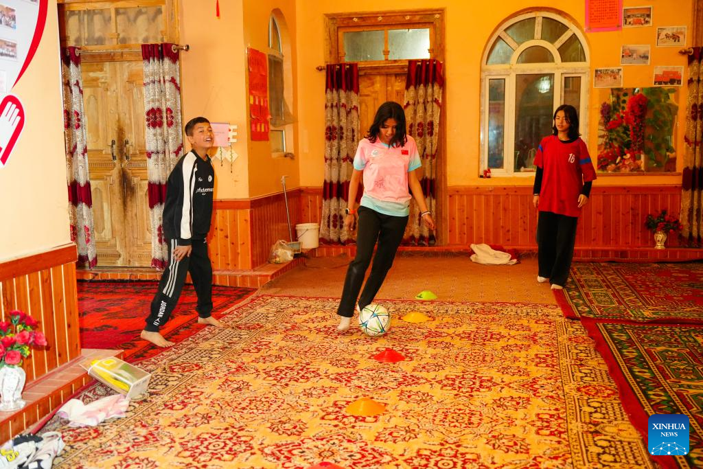 Aniza Abudurusul (C), a member of the U13 girls' football team of Artux City, plays football with her younger brother (L) and a friend at home in Artux City, Kizilsu Kirgiz Autonomous Prefecture in northwest China's Xinjiang Uygur Autonomous Region, April 13, 2025. (Xinhua/Xu Hongyan)
