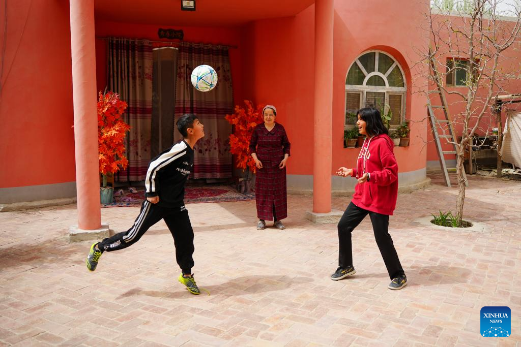 Aniza Abudurusul (R), a member of the U13 girls' football team of Artux City, plays football with her younger brother (L) and mother at home in Artux City, Kizilsu Kirgiz Autonomous Prefecture in northwest China's Xinjiang Uygur Autonomous Region, April 13, 2025. (Xinhua/Xu Hongyan)
