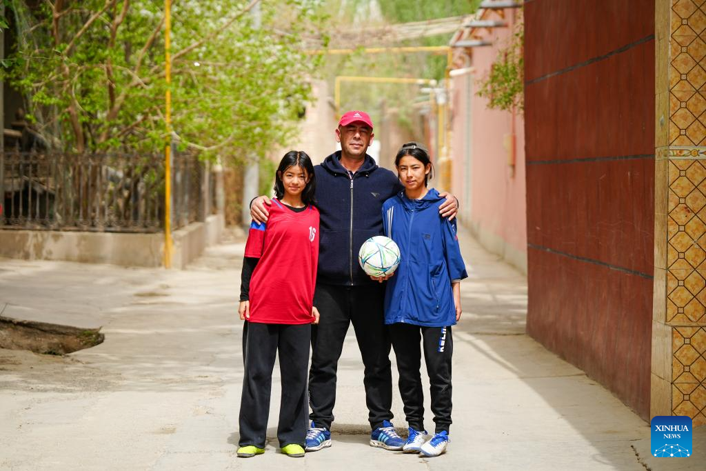 Nafisa Abuduwali(R), a member of the U13 girls' football team of Artux City, takes photos with her father (C) and younger sister in Artux City, Kizilsu Kirgiz Autonomous Prefecture in northwest China's Xinjiang Uygur Autonomous Region, April 13, 2025. (Xinhua/Xu Hongyan)