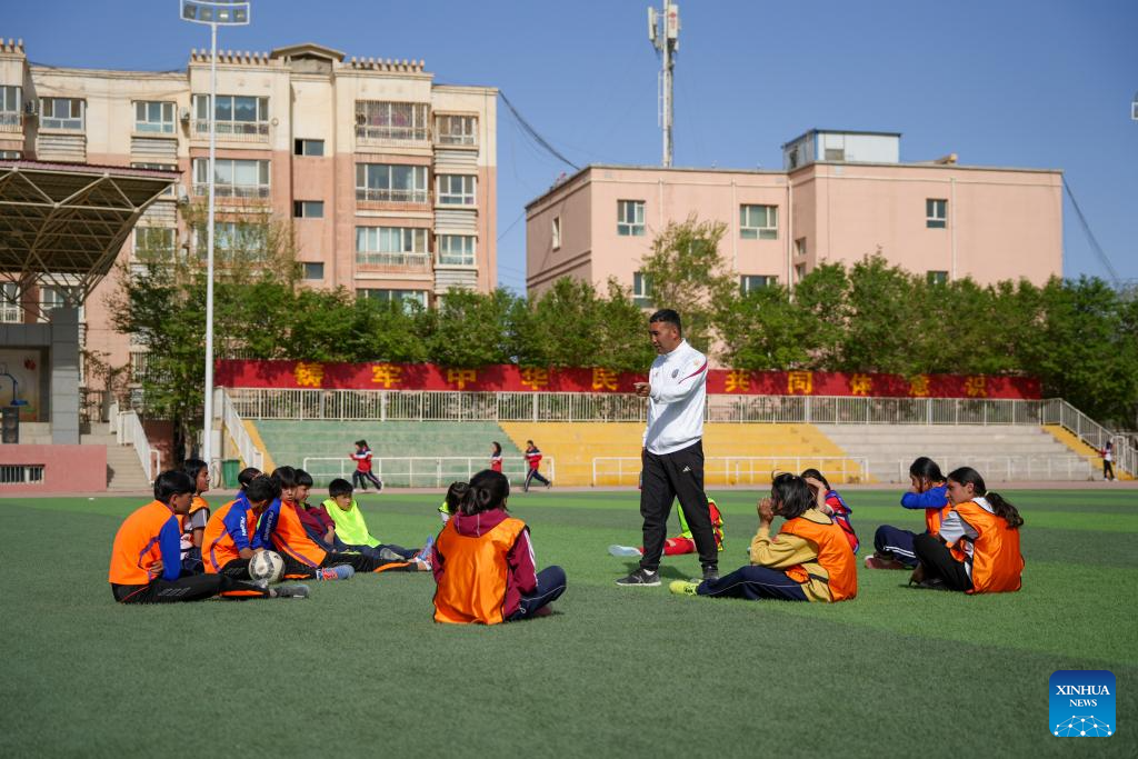 Coach Rozaji Amatjan (C) instructs girls of the U13 football team of Artux City during a training session in Artux City, Kizilsu Kirgiz Autonomous Prefecture in northwest China's Xinjiang Uygur Autonomous Region, April 10, 2025. (Xinhua/Xu Hongyan)